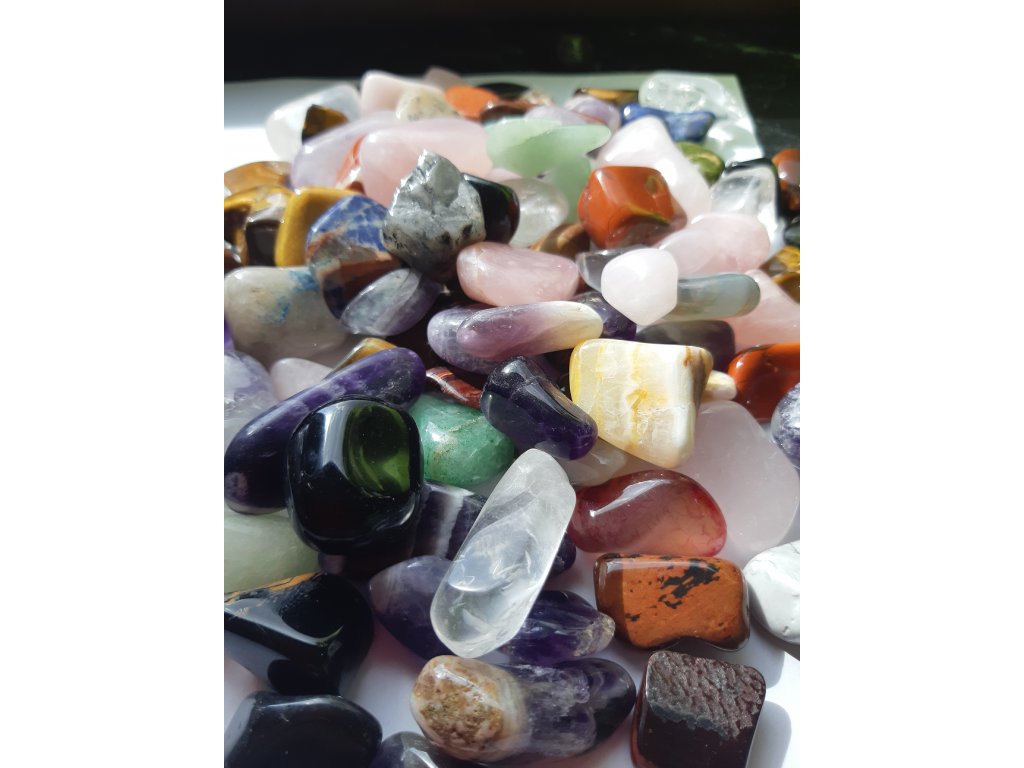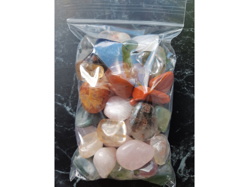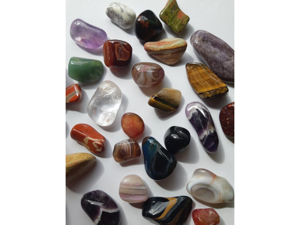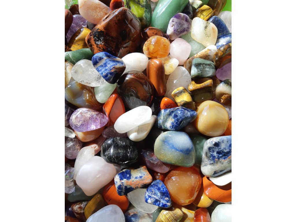 MIX obsahuje běžné druhy kamenů v kvalitě A/B- ametyst, růženín, křišťál, chalcedon, achát, sodalit, jaspis plus další druhy podle aktuální nabídky.